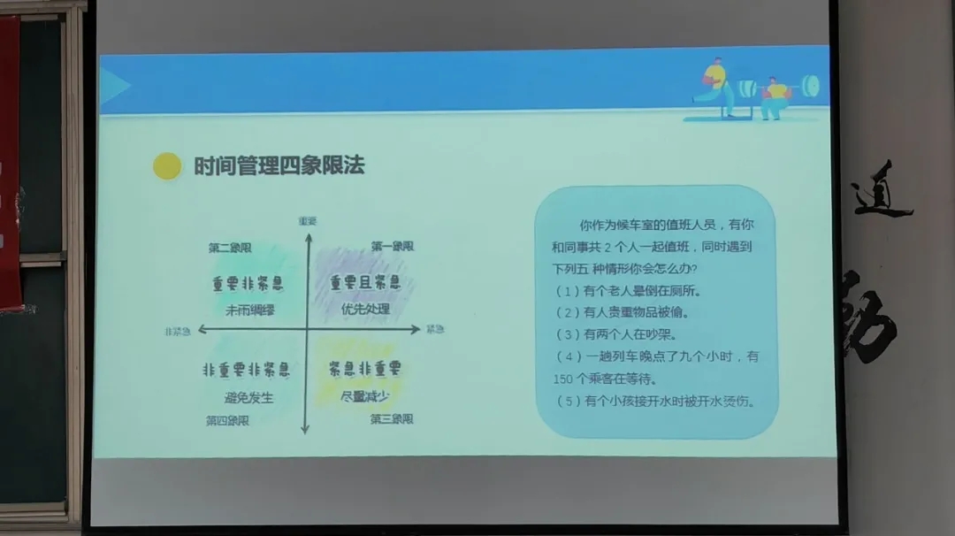 第一部分内容,刘老师先向同学们讲解了时间管理的概念以及方式。然后讲述了不进行时间管理会出现哪些现象:假努力,每天忙,但是没有成果;很多计划做不完,焦虑的玩手机;事情来一个做一个,真正重要的没做。其次列举了撒切尔夫人有效进行时间管理的事例来证实进行时间管理的好处,最后又向大家介绍了时间管理四象限法。同学们了解过后,老师将一道公务员考试题展现在大屏幕上,让同学们讨论,经过一番讨论后,与同学们互动,使同学们更好地理解时间管理,进一步做好时间管理。