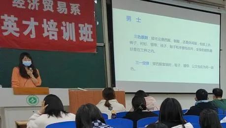 第二部分王馨平老师主要从三方面展开讲解,首先王老师通过展示一张漫画解释了晕轮效应的原理。其次通过视频和图片给我们讲授了男生和女生在服饰搭配以及选色上的方法和大忌,然后王老师教给了我们言谈礼仪的3A原则以及社会上五大禁忌。
