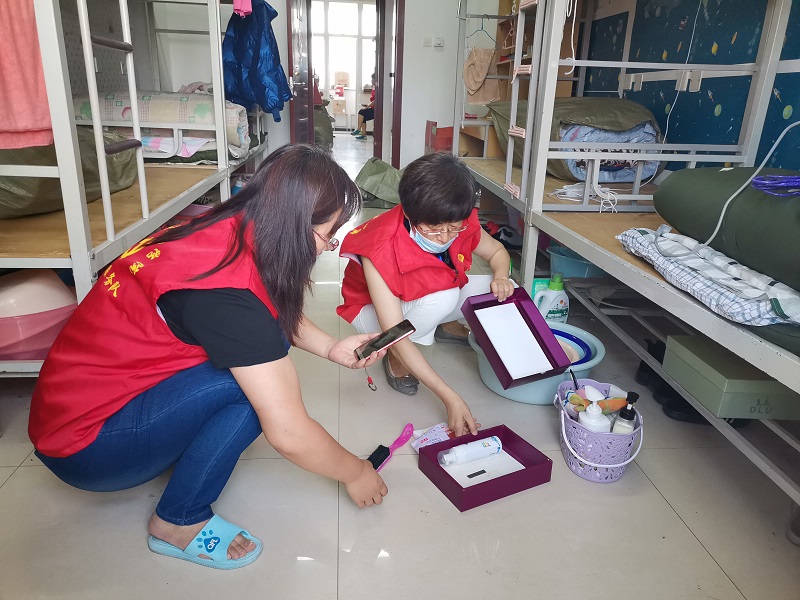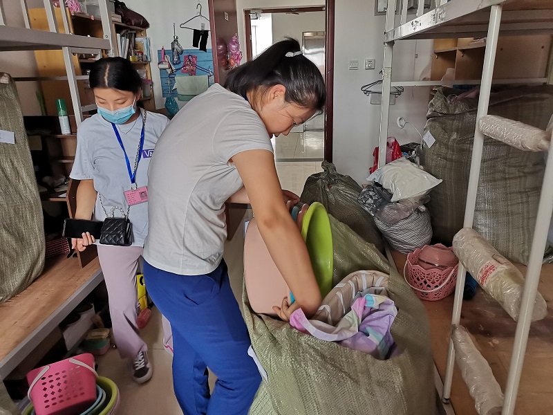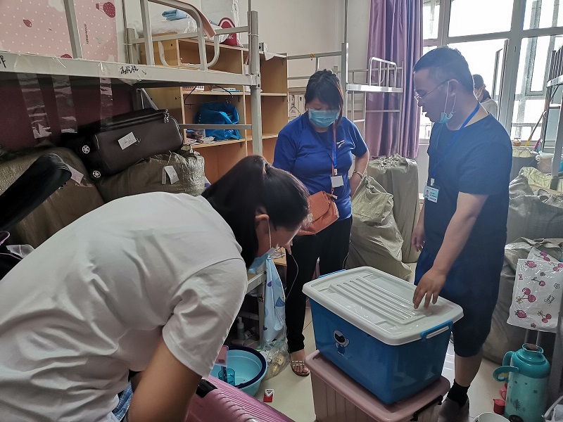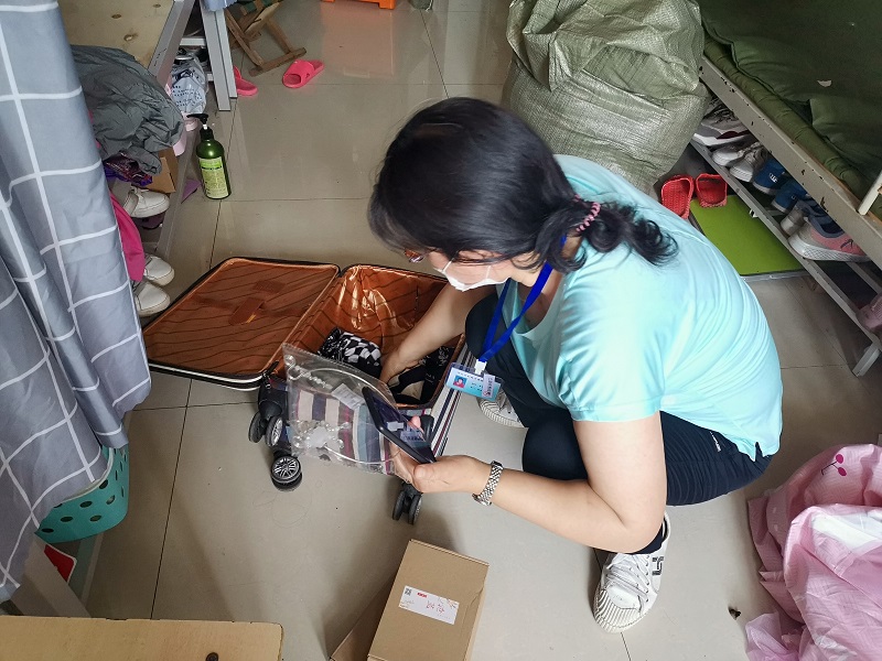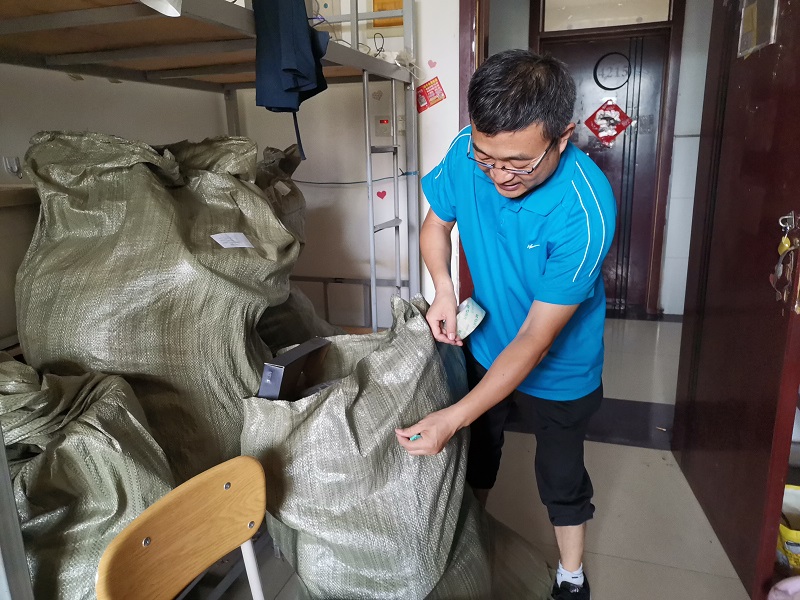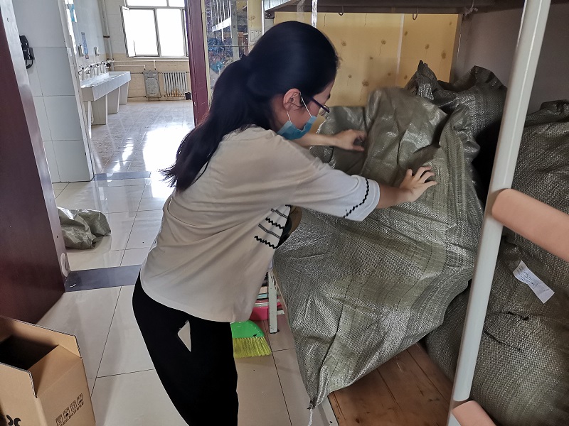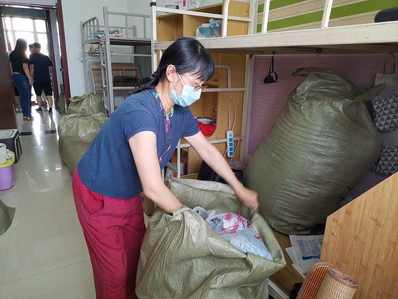 每名教师志愿者负责一个宿舍的行李打包邮寄工作,在进入学生寝室与返校学生进行沟通,并与学生进行视频连线,确认位置,核实需要邮寄的物品,耐心询问物品是否留存,并进行分类整理,方便快递公司打包。“在进门右手第一个床位上铺,拿会计资格考试书籍” “老师,我的团员证在衣柜里面” “老师,您把桌子上面的粉色盒子打开我看一下”“老师,麻烦您把床旁边的衣服帮我打包一下”“阳台右手边自上往下第二个柜子里的材料袋子,有我的证书” “老师,你们辛苦了”。经过仔细核查后,按照一人一袋的方式用袋子将物品打包,黏贴邮寄信息。