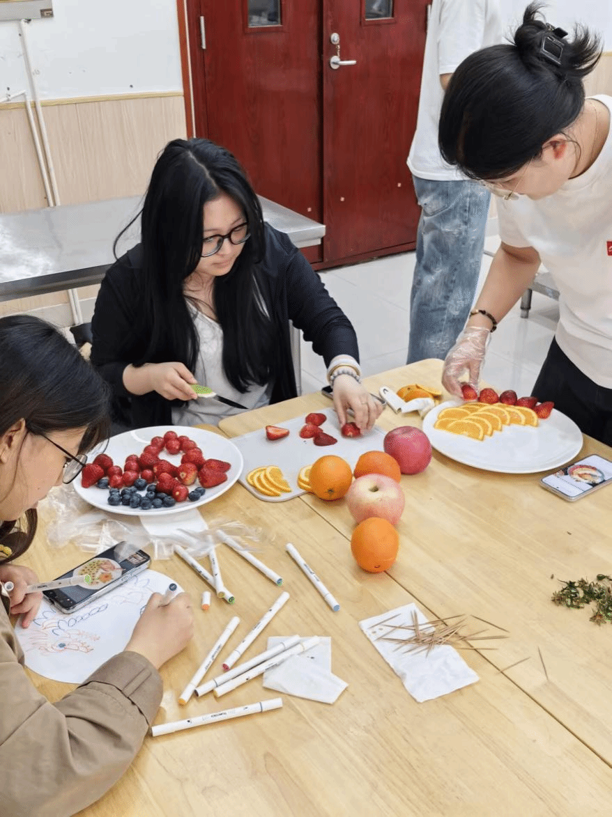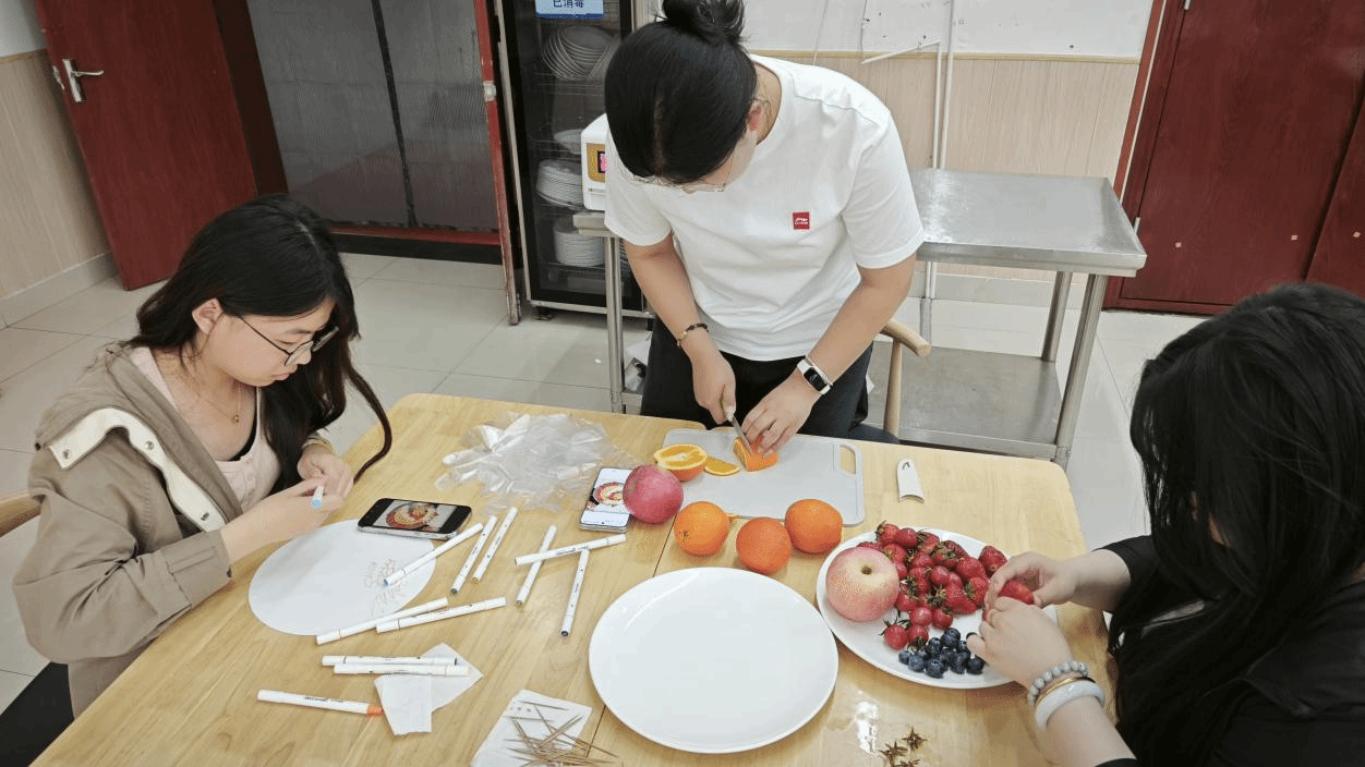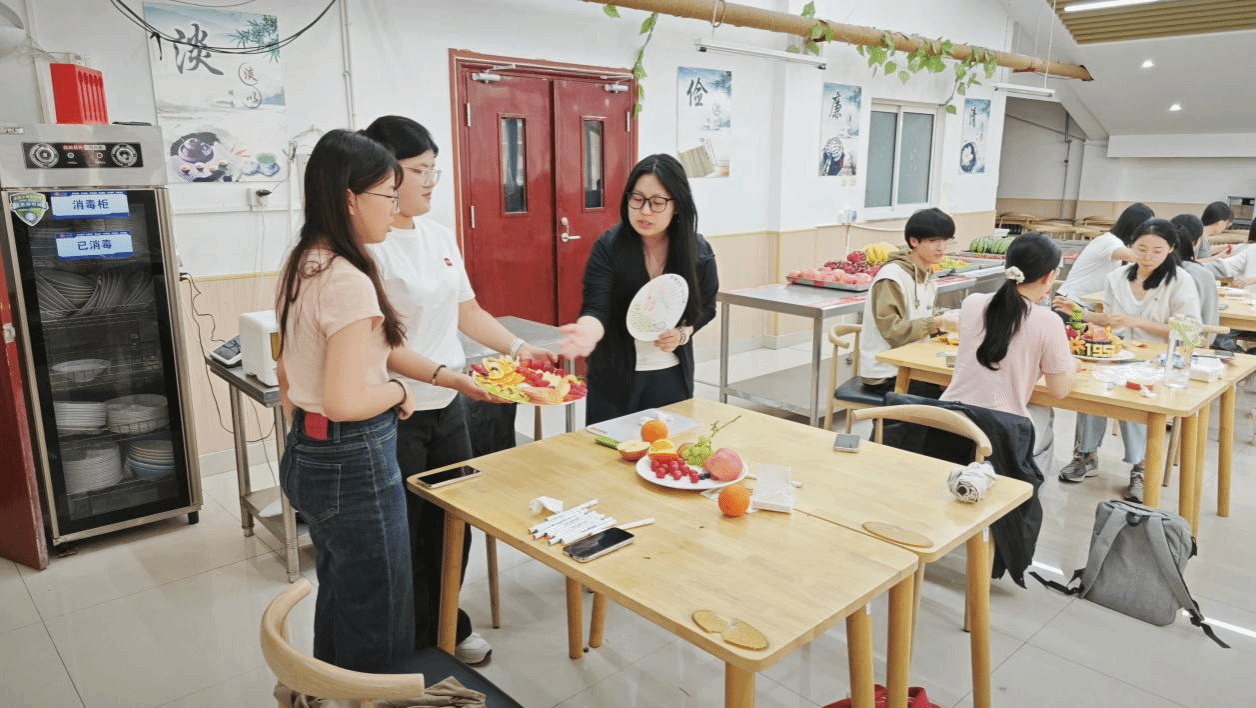 在赛前筹备过程中,我系代表队积极思考,搜集各种资料,结合当下实际策划参赛作品草图,每一个环节都精心策划、反复推敲,学习水果雕刻技巧,力求打造出既具艺术美感又富有文化内涵的作品。在准备过程中,任冠华老师鼓励参赛队员放平心态,过程中的每一次构思、每一番协作、每一回尝试,皆是成长积淀。须知厚积方能薄发,在全心雕琢拼盘时,收获已在其中。不必执念结果,专注脚下,功夫到处,成果自会如清泉顺势而涌。
