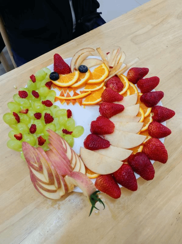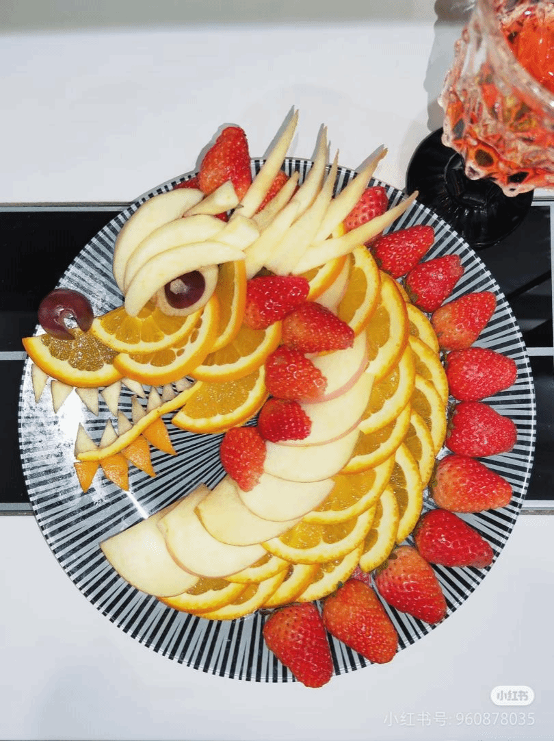 在制作过程中,三位同学充分发挥创意和技巧。她们先将橙子切成薄片,精心摆弄成龙身和凤尾的轮廓,展现出灵动的线条感;用草莓雕刻成龙鳞和凤羽,鲜艳的红色为作品增添了喜庆的氛围;苹果则被切成小块,巧妙地组合成龙凤的头部和爪子,形态逼真;葡萄作为点缀,散落在拼盘周围,象征着吉祥如意。每一片水果的切割、每一个造型的塑造都凝聚着同学们的心血和智慧,体现了他们对劳动的热爱和对美的追求。
