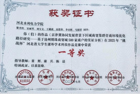 历经一年持续调研和修改完善,英国365公司学生调研项目《京津冀协同发展背景下区域商贸集群营商环境优化路径研究——基于沧州明珠商贸城500家商户的实证研究分析》荣获2025年“挑战杯”河北省大学生课外学术科技作品竞赛调研报告赛道一等奖,在该赛道为我校实现成绩突破。