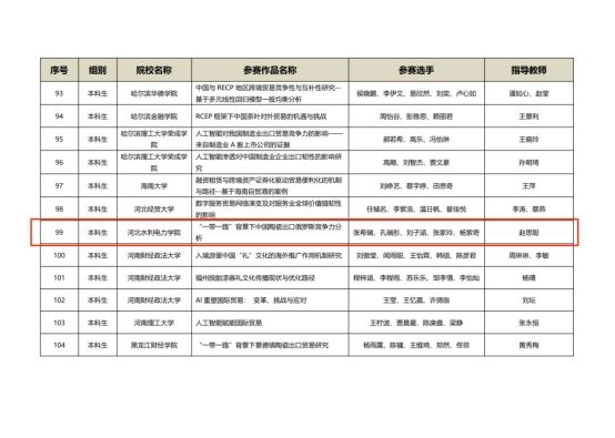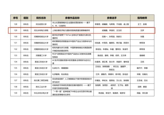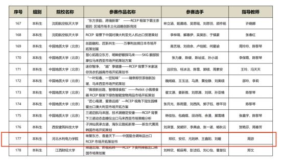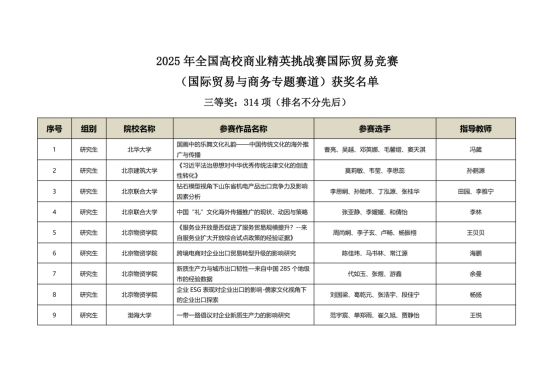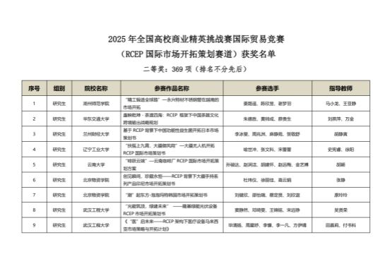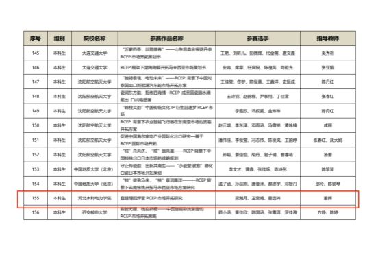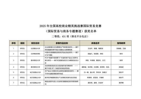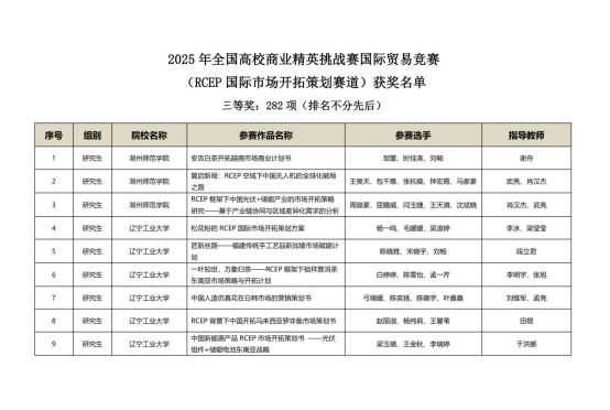 11月20日,2025年全国高校商业精英挑战赛国际贸易竞赛(RCEP国际市场开拓策划赛道、国际贸易与商务专题赛道)圆满落幕。我系4支队伍晋级国赛,斩获2项全国二等奖、2项全国三等奖,成绩喜人。郑欣、安欣、尤则婷、王鑫阳、刘暖团队作品《味聚东方,香邀天下——中国复合调味品出口RCEP市场开拓策划书》(指导教师周游)、武婧鑫、李语欣、王玉欣团队作品《上海会展经济助力国际贸易高质量发展策略研究》(指导教师王梦)荣获全国二等奖;梁瀚月、王紫嫣、董远祎团队作品《直缝埋弧焊管RCEP市场开拓研究》(指导教师董辉)、张希瑞、孔瑞彤、刘子涵、张家玲、杨紫奇团队作品《“一带一路”背景下中国陶瓷出口俄罗斯竞争力分析》(指导教师赵思聪)荣获全国三等奖。