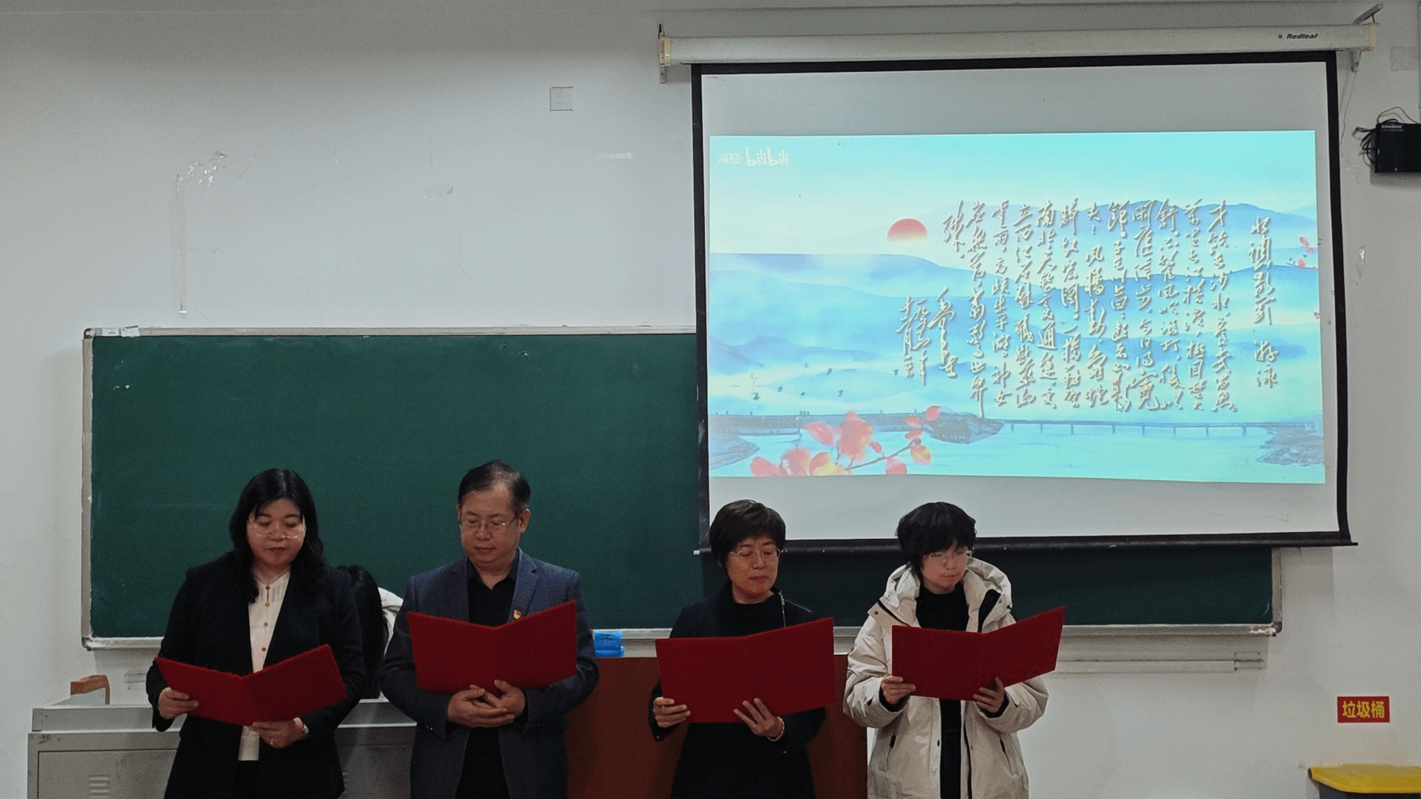 伴随着悠扬的伴奏,朗诵会正式拉开帷幕。经济与金融教研室的老师们率先登场,带来经典篇目《沁园春·雪》。"北国风光,千里冰封,万里雪飘",老师们的朗诵铿锵有力,气势恢宏,将毛泽东同志笔下的山河壮丽展现得淋漓尽致。接着,跨境电商教研室的老师们以《采桑子·重阳》惊艳亮相。不同于前序节目的激昂澎湃,他们的朗诵温婉中透着坚定,细腻中饱含深情。老师们用温润而富有感染力的语调,诠释着共产党人乐观向上的精神风貌与对革命胜利的坚定信念。