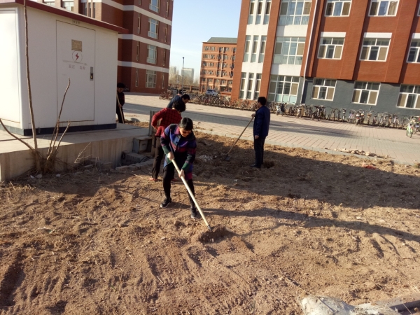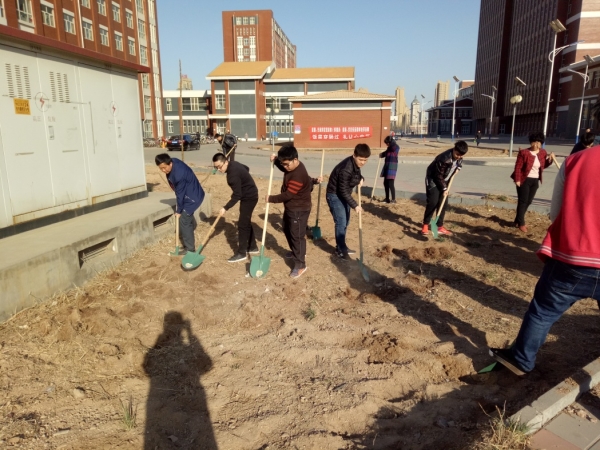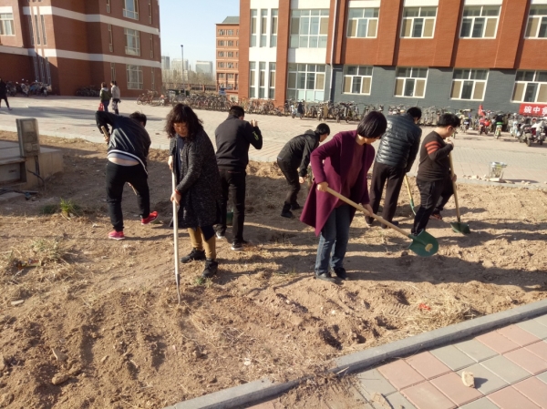 为响应学校美化校园的号召,英国365公司师生于植树节下午积极修整绿化区土地,为日后栽种树苗做好准备。一领到绿化工具,各位老师、同学们就热火朝天地干了起来,胡景明书记细心为同学们平整土地的要领,芮红主任亲身示范,仍不忘嘱咐大家注意身体、预防感冒。经贸系师生经过一个多小时的劳动,顺利完成了预定的任务。