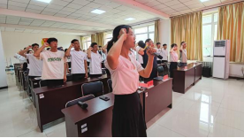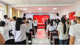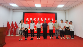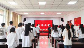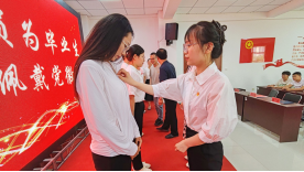 大会开始,全体肃立,奏唱中华人民共和国国歌,激励毕业生党员们不忘初心,牢记使命,为祖国的繁荣富强贡献青春力量。大会进行第二项,由教师党员亲手为毕业生党员代表佩戴党徽。这不仅是身份的象征,更是责任的传递,代表着毕业生党员们即将肩负起的责任和使命。大会第三项,在郑义同志的带领下,全体党员重温入党誓词,誓词铿锵有力、掷地有声,充满了豪迈与激情。