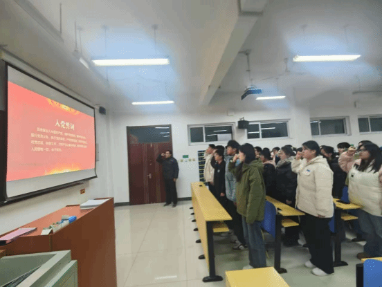 随后,在任老师的带领下,学生党员们举起右拳,面向党旗,郑重宣誓:“我志愿加入中国共产党,拥护党的纲领,遵守党的章程,履行党员义务……”誓言铿锵有力,回荡在教室的每一个角落,彰显出预备党员们对党的忠诚和对共产主义事业的坚定信念。