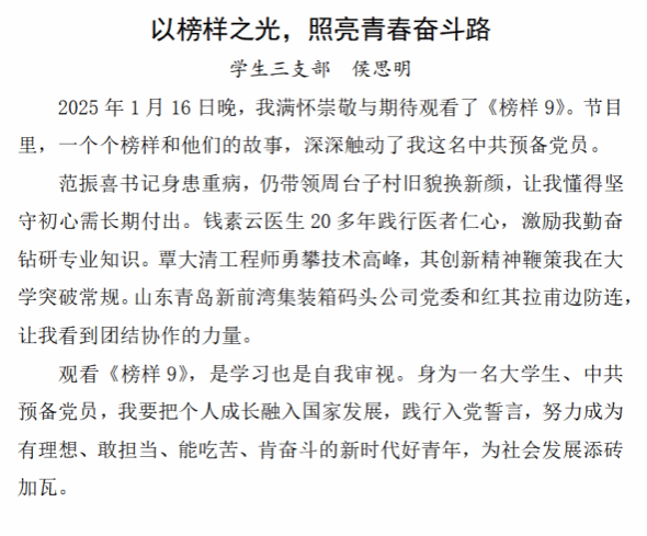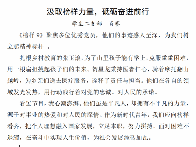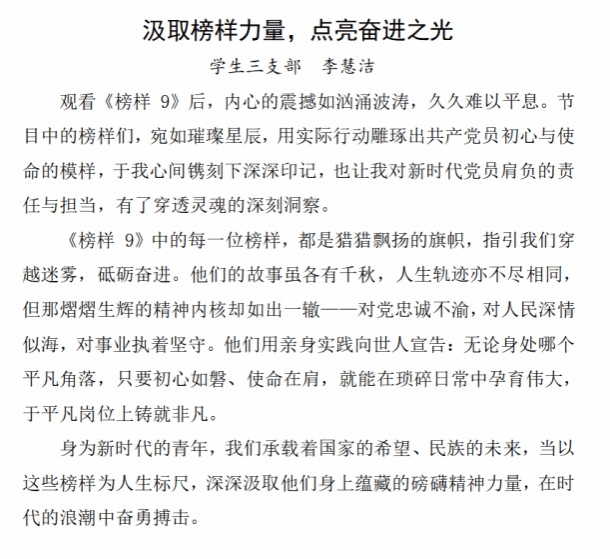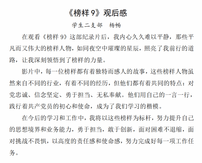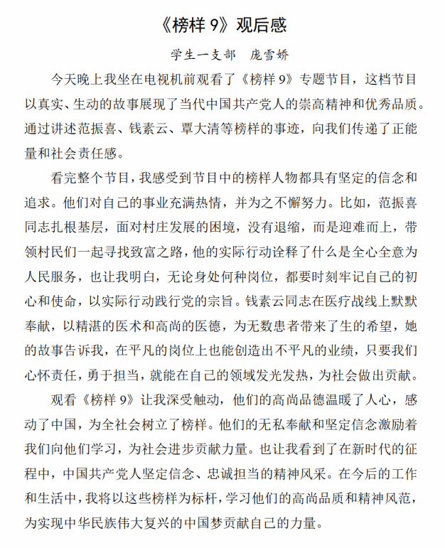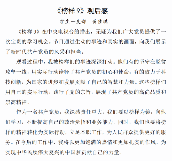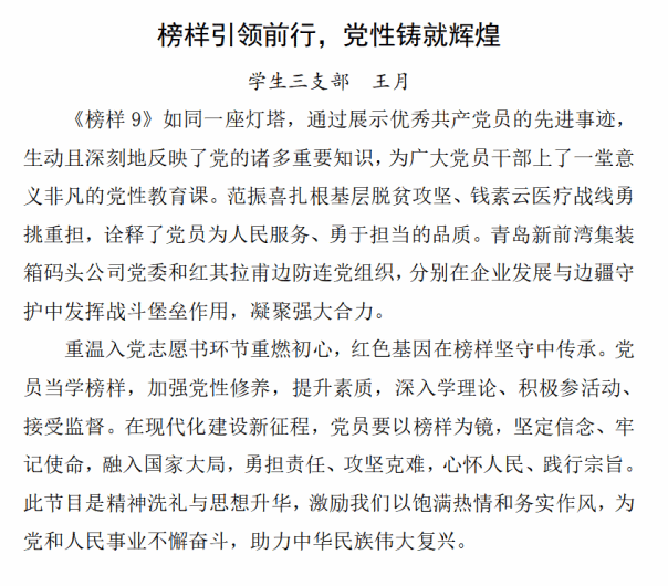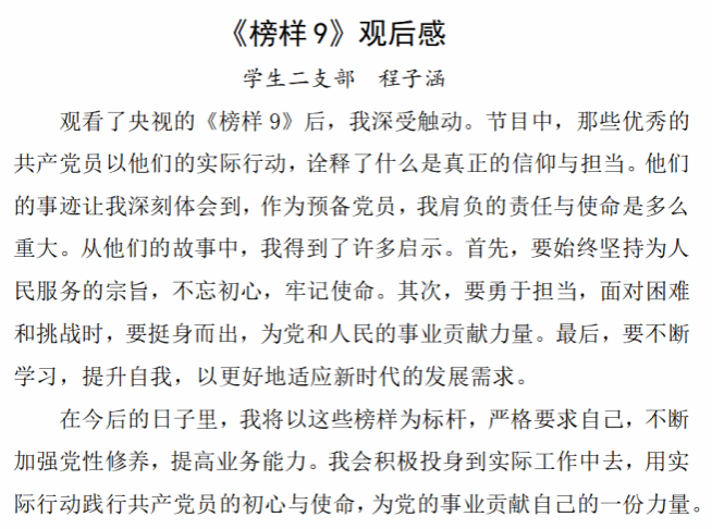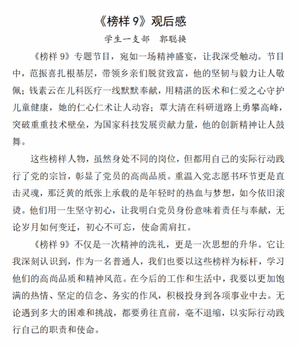 《榜样9》专题节目,通过范振喜、钱素云、覃大清、陈清洲、刘小京、黄德宽、林则银7名党员以及山东青岛新前湾集装箱码头公司党委、陆军某边防团红其拉甫边防连的先进事迹,鲜活地呈现出一系列基层党组织和优秀共产党员的崇高品质与精神风貌,为我们树起榜样典范旗帜,我系全体党员深受鼓舞。教师党员们观看完专题片后纷纷表示,要以先进典型为榜样,以更高的标准要求自己,牢记初心使命,以高度的政治责任感和使命感,提振干事创业的精气神,高质高效完成各项工作任务,不断为学校教育高质量发展贡献智慧和力量。