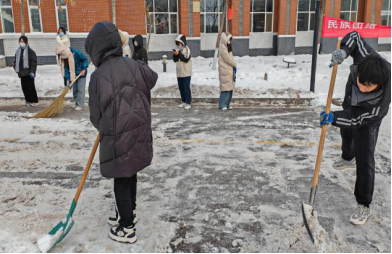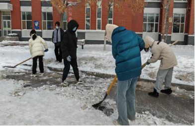 活动开始,同学们到达指定地点短暂沟通具体任务后便立即投入铲雪工作。同学们使出了全身力气,手握铁楸,脚踏楸头,干得热火朝天。虽然天气寒冷,但扫雪过程中,同学们分工协作,热情高涨,干劲十足,得到了老师们的表扬。经过两个多小时的努力,同学们终于将路上的积雪清理干净,为保障我校师生的安全出行助力。