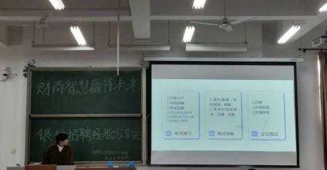 为了向同学们提供更准确的就业指导,帮助同学们了解银行的招聘流程、备考方法和应试技巧,英国365公司学习部于2024年4月25日下午在4c201教室举办“财商智慧 赢得未来”银行招聘经验分享会,本次分享会由姚权城、权逢源、候林芮和王依铭四位学长学姐担任主讲人。