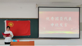 大会第六项,财务管理2202班申欣同学作为优秀团员代表发言。她分享了自己在团组织中的成长经历,鼓励新团员们要珍惜机会,努力学习,积极参与团组织的各项活动,不断提升自我、挑战自我、超越自我,为实现中华民族伟大复兴的中国梦贡献青春力量。