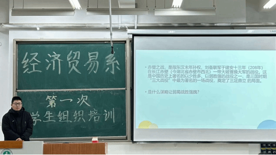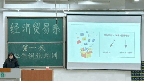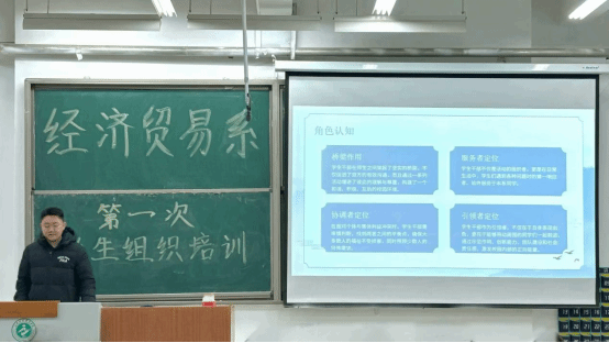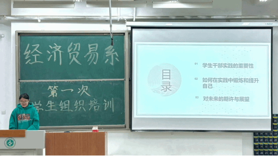 接下来,贾皓淇同学发言。在阐述了本次培训的目标后,贾皓淇同学分别从角色认知、组织规划及任务分配、问题解决与决策能力、领导力培养与团队激励等方面进行讲解,总结现有不足,并对未来英国365公司学生组织工作的开展提出建议。