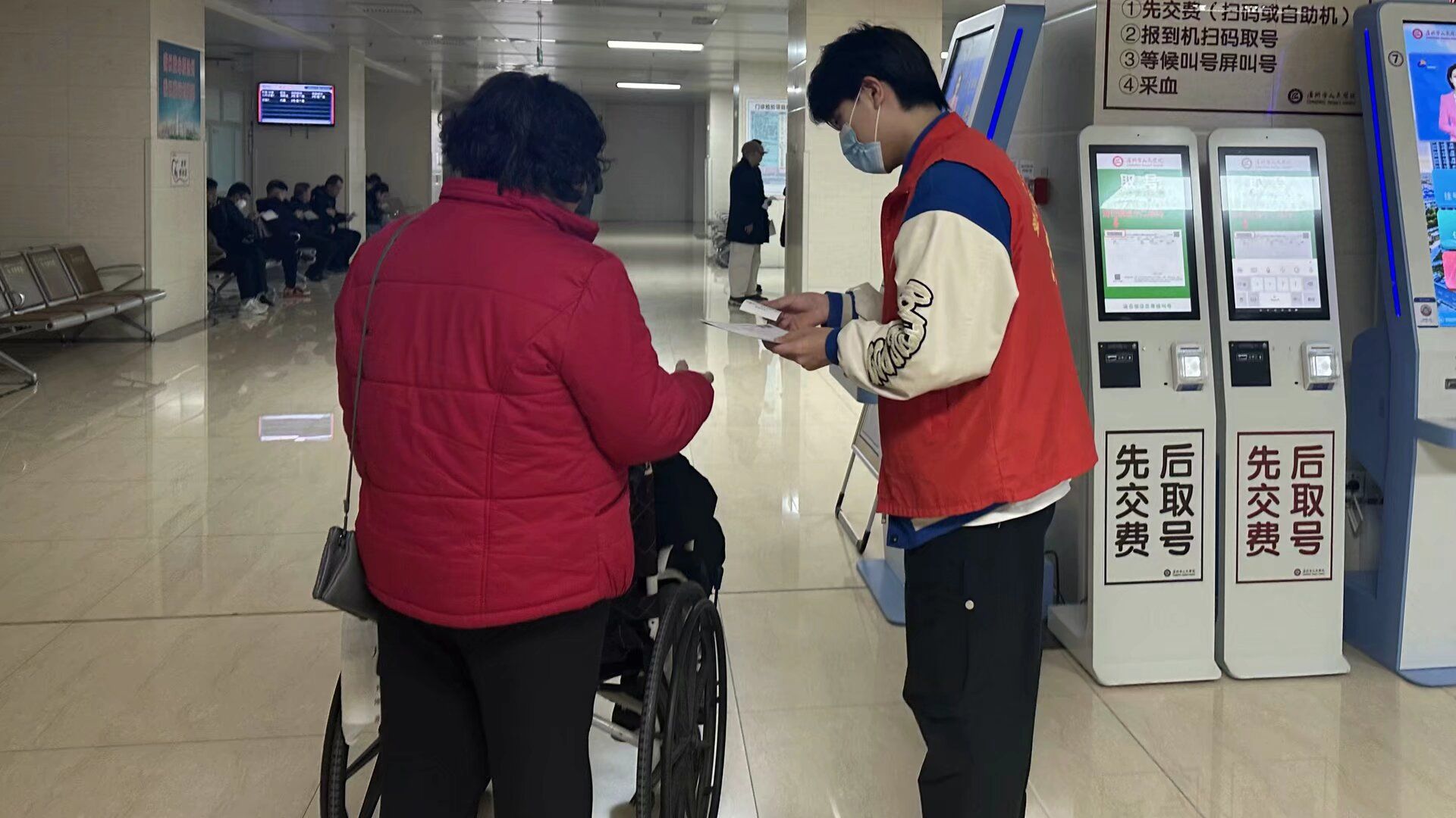 培训结束后,志愿者们迅速投入到各自的岗位中,他们有的在自助挂号机前耐心指导患者操作,有的在候诊区与患者亲切交流,还有的在综合服务中心维持秩序。服务结束后,志愿者们化身“就医体验官”,填写门诊反馈表格,从患者视角提出流程优化建议,为医院服务改进提供了数据支撑。
