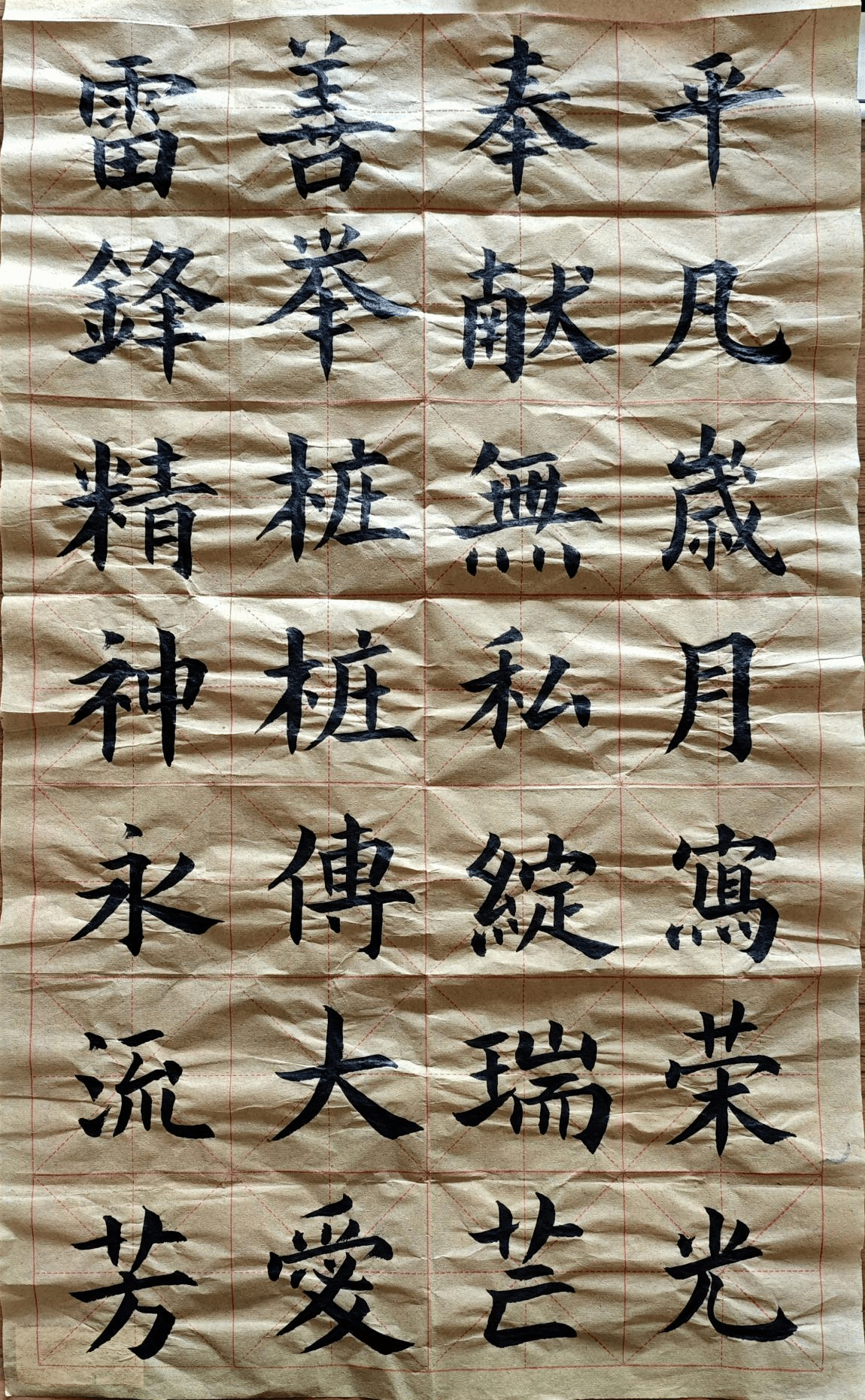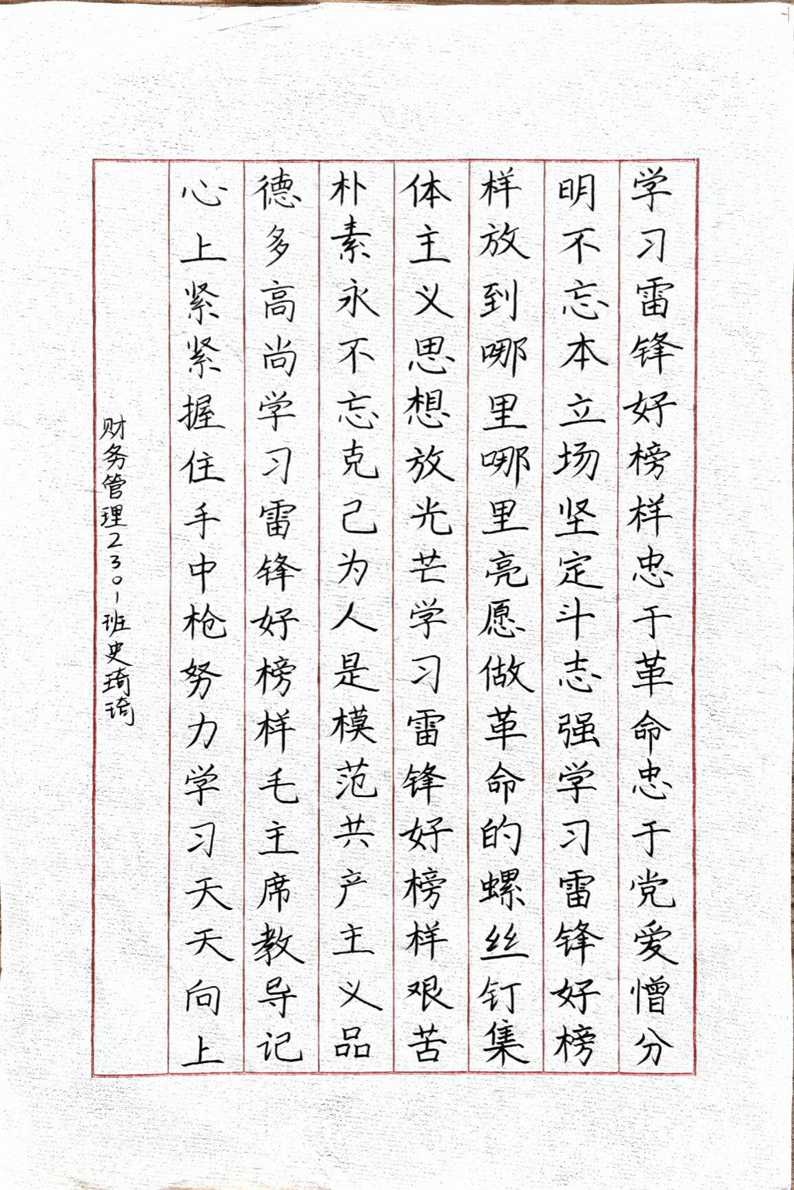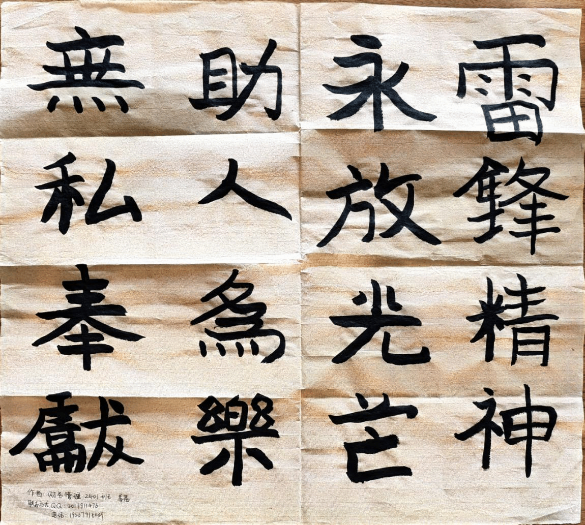 在本次雷锋书法活动中,同学们满怀澎湃热忱踊跃参与,以笔墨为载体,生动勾勒出雷锋精神的深刻轮廓。灵动字体搭载着雷锋精神的深刻内涵,淋漓尽致地体现出传承雷锋精神的决心。此次活动划分为硬笔书法与软笔书法两大类别,同学们在各自擅长的领域各施所能,凭借别具一格的构思与炉火纯青的书法技艺,深刻诠释着雷锋精神的时代价值。