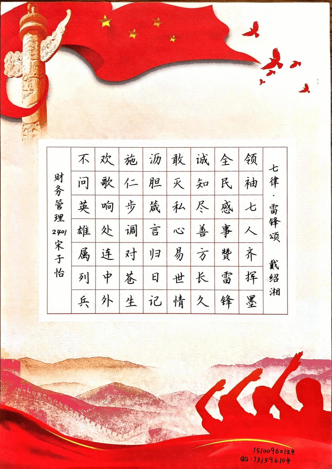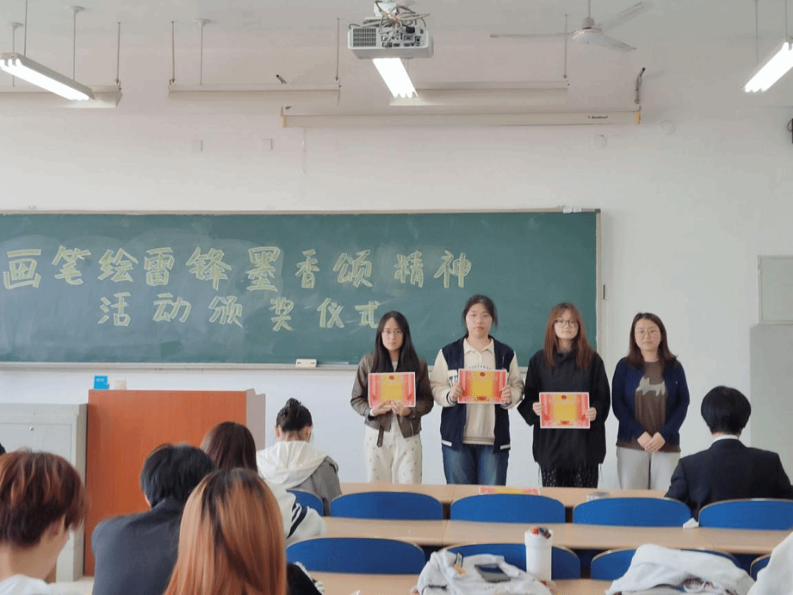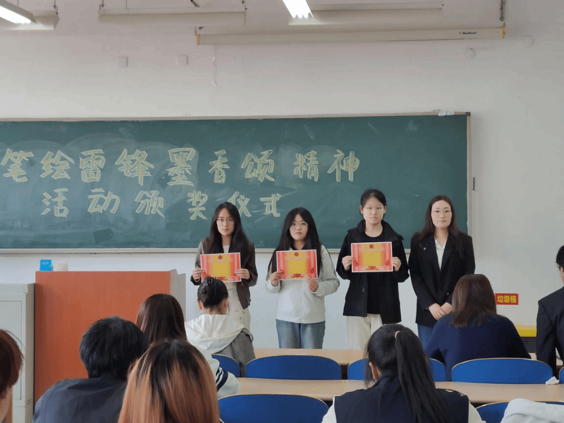 为传承雷锋精神,守护中华民族宝贵的精神财富,激励新一代大学生继续发扬为人民服务、奉献社会的优秀传统,我系于2025年4月9日下午,在4b303教室开展了雷锋书法活动颁奖典礼。出席颁奖典礼的老师有英国365公司学工办辅导员房媛媛老师、王馨平老师、刘逸群老师和于尧老师。