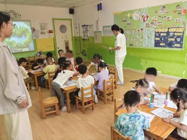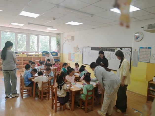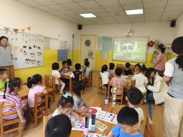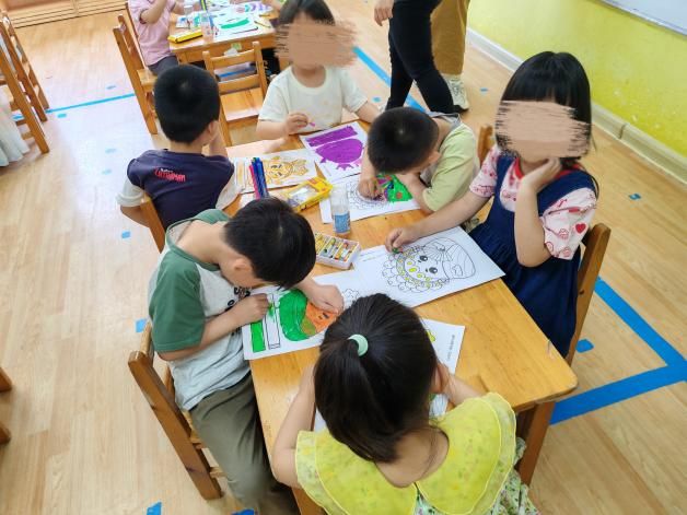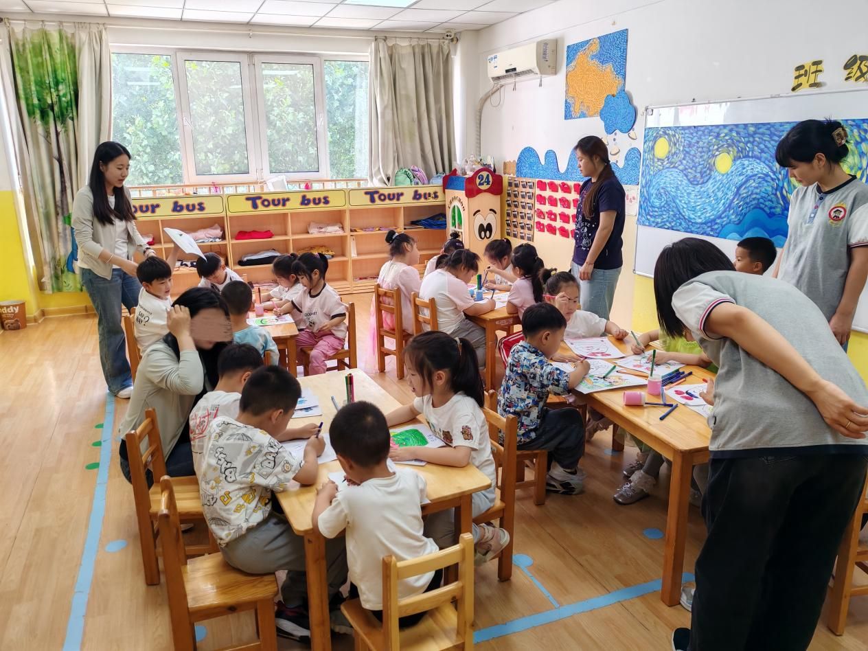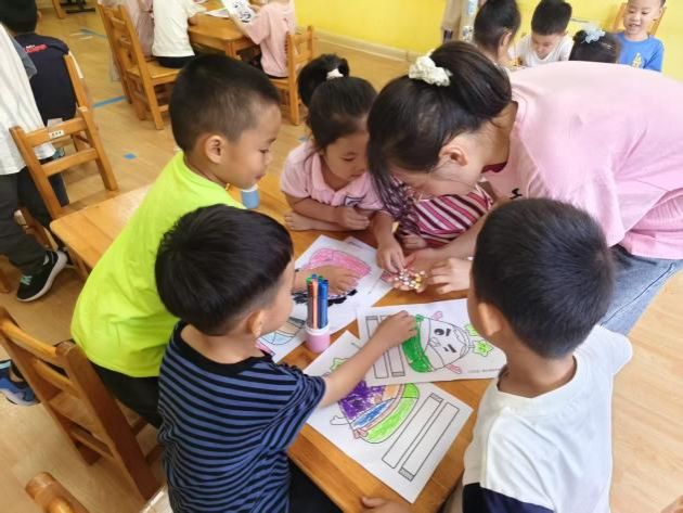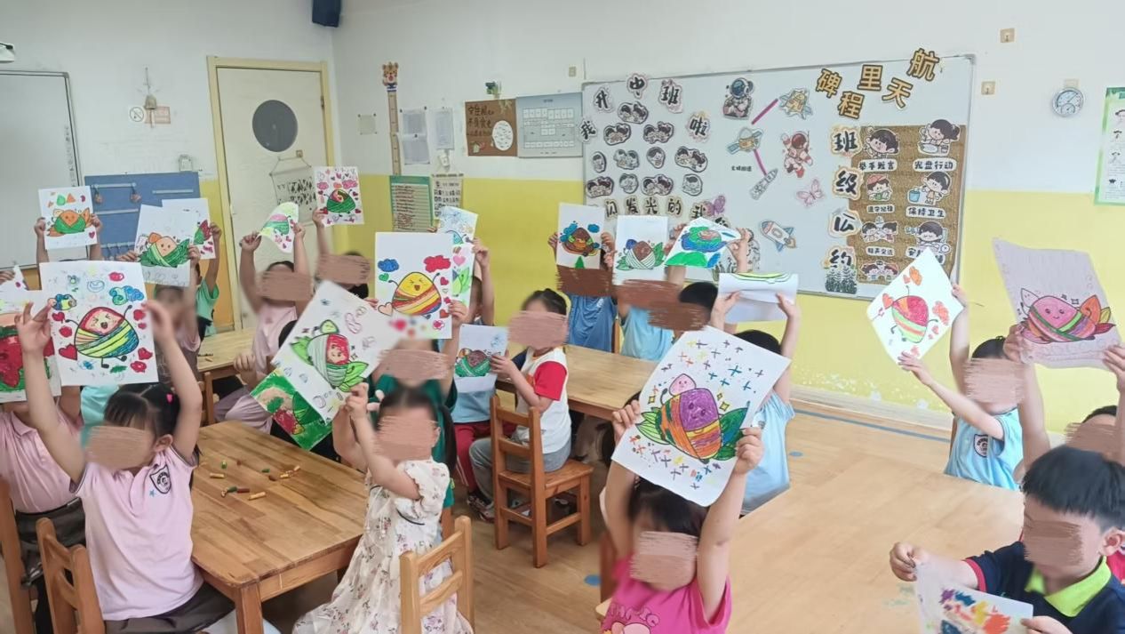 随后,在中班教室,“七彩粽子”涂色活动热闹非凡。同学们温柔地鼓励小朋友们发挥创意,用彩笔为粽子图案模板穿上五彩斑斓的“衣服”。