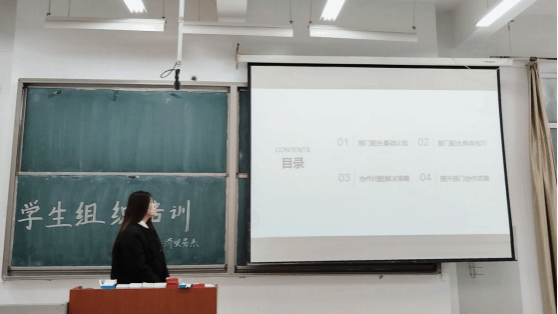 活动开始,张佳欣同学以“部门配合”为主题,从基础认知、具体技巧、解决问题和提升效果四个角度进行讲解,从而帮助同学们在部门中能更好地配合,提高工作效率,增强团队凝聚力,为构建高效和谐的团队提供了清晰的行动指南。