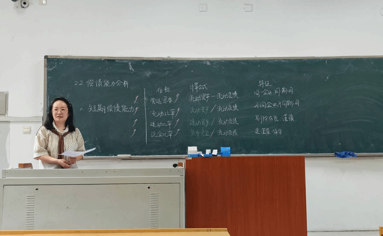 黄召雨老师以《财务分析》“2.2偿债能力分析——短期偿债能力”为内容设计板书。清晰罗列营运资本、流动比率、速动比率、现金比率四项核心指标,对应呈现“流动资产-流动负债”“流动资产/流动负债”等计算公式,同步梳理“同一企业同期间、不同企业不同期间”等特征,以及“易除存货-谨慎、更谨慎-保守”等分析要点。板书布局规整,以箭头关联指标与公式,用不同颜色区分关键内容,构建出层次分明、重点突出的短期偿债能力分析知识框架,助力学生快速掌握财务分析核心逻辑。
