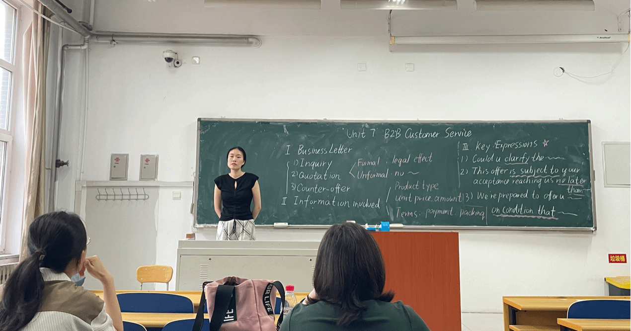 周洁晨老师围绕《跨境电商专业英语》课程中“Unit7 B2B Customer Service”展开板书设计。从业务信函Business Letter维度,清晰梳理“询盘Inquiry、报价Quotation、还盘Counter-offer”业务流程,区分正式与非正式信函差异;在业务信息板块,明确产品类型Product type、单价数量unit price,amount、付款包装等条款Terms:payment,packing;关键表达Key Expressions部分,运用实用句式,助力学生掌握跨境电商业务英语沟通要点。