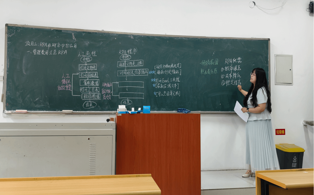 王海棠老师围绕《智能财务》“项目三:RPA在财务中的应用——管理费用汇总RPA”进行板书。从人工流程与RPA程序两大维度展开,人工流程清晰呈现“打开文件、复制数据、填写信息”等步骤;RPA程序则梳理“运行流程、文件处理、数据传输”逻辑,通过“运行python表达式,遍历计次循环、获取区域文本”等实操要点。同时,提炼“科技报国、职业责任感”理念,阐述RPA“效率提升、成本降低、稳定性高”优势,将技术应用与价值引领相融合,以丰富色彩区分板块、箭头串联流程,构建出清晰且具深度的知识体系,展现对智能财务课程的创新讲授。