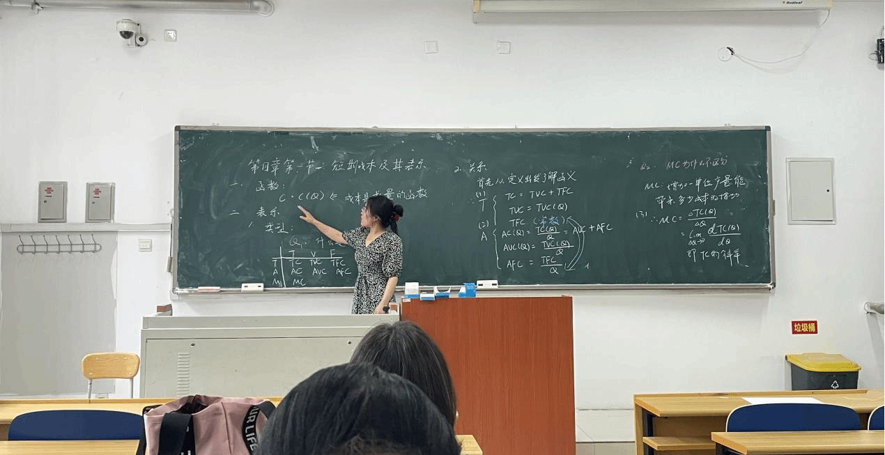 刘心怡老师聚焦《经济学原理》“第4章第一节短期成本及其表示”内容展开板书。从函数层面,明确“C=C(Q)(成本是产量的函数)”核心关系;表示维度,先梳理“TC(总成本)、TVC(总可变成本)、TFC(总固定成本)”等类型,借助清晰的坐标图示呈现各成本曲线关联,再通过公式推导,解析“AC(平均成本)、AVC(平均可变成本)、AFC(平均固定成本)”与总成本的关系,最后延伸探讨“MC(边际成本)”的定义及与总成本曲线斜率的联系,以严密的逻辑、规范的公式推导,构建起短期成本理论的知识体系,展现出对经济学原理课程的深度理解与清晰讲授思路。