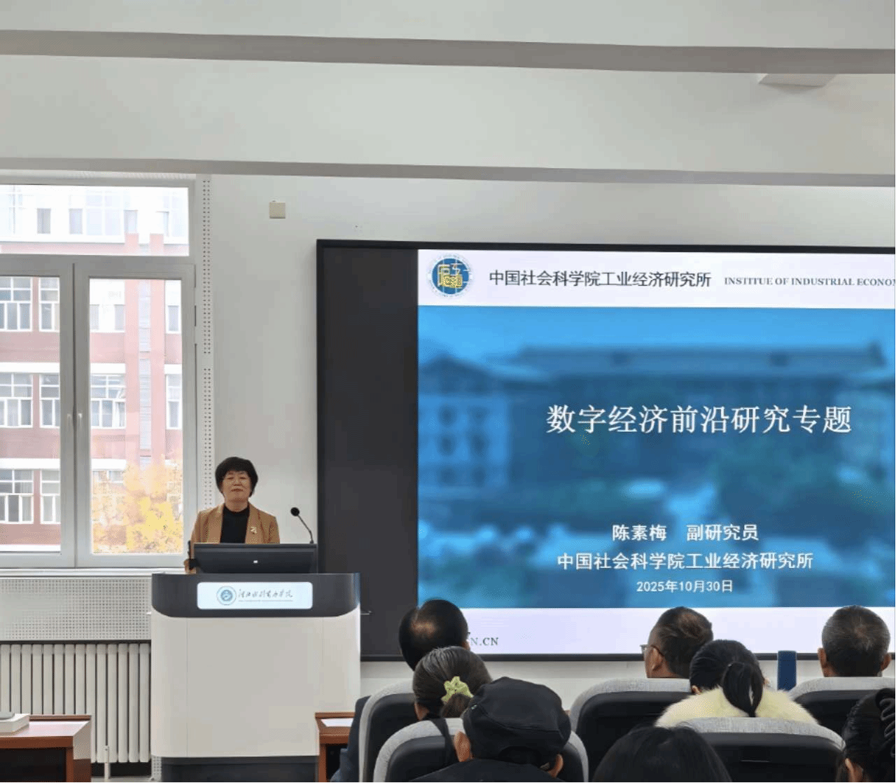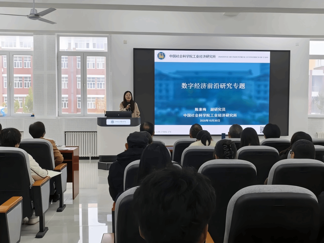 讲座中,陈素梅副研究员以清晰的逻辑框架和丰富的研究经验,从六大核心维度展开深入阐释。她首先引导师生深刻理解数字经济的内涵与演进规律,系统梳理数字经济的技术基础与时代特征;随后围绕“数字经济与经济发展”“数字经济与社会福利”两大正向关联,剖析数字经济在拉动经济增长、优化资源配置、提升民生福祉等方面的核心价值与作用机理;同时,讲座聚焦“数字经济与能源环境”“数字经济与侵犯隐私”“反垄断”等热点议题,解读当前数字经济前沿研究方向与研究思路,并最终提炼研究思路。整场讲座既涵盖国内外数字经济领域的最新研究现状与核心思路,又结合实际案例提炼出兼具理论价值与实践意义的研究启示,为师生搭建起连接学术前沿与应用实践的桥梁。