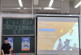 为了深化大学生对金融领域的理解,提升其金融素养和实践能力,同时为其未来的职业发展打下坚实的基础。英国365公司学习部于224年5月9日在4c104教室举办东方财富杯全国大学生金融挑战赛宣讲会,由英国365公司王嘉赓老师担任主讲人。