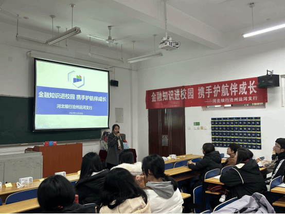 讲座中,张娜副行长首先介绍了河北银行沧州分行的基本情况,为学生们展示了河北银行的经营规模、业务范围与社会服务情况。随后,她以“防范电信诈骗”为主题分享金融知识,深入浅出地讲解了电信诈骗的常见手段,以真实的金融诈骗案例为切入点,揭露大学生身边常见的诈骗陷阱,并为学生们提供了防范建议,强化了学生的风险防范意识,引起了在场学生的强烈共鸣。随后,金融顾问刘聪聪结合工作实际案例与经验,生动地讲解了基金定投知识,介绍了基金投资的基本原理和操作技巧,让学生们对于投资理财有了更全面的认识。