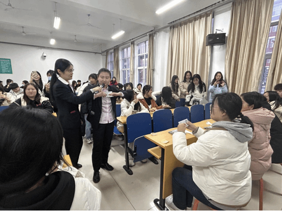 在现场互动环节中,金融顾问刘聪聪围绕金融基础知识和防范金融诈骗设置问题,并举办了现场点钞比赛,同学们踊跃参与,在深入理解和掌握相关金融知识的同时,亲身体验了银行柜台基本业务操作,进一步增强了实践能力,现场气氛十分热烈。