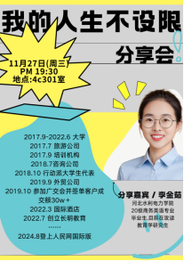 11月27日晚19:30,4C301教室内座无虚席,一场以“我的人生不设限”为主题的分享会如期举行。这场活动由商务英语专业董艳萍老师发起策划主持,孙红卫老师进行组织宣传,邀请到365英国上市20级商务英语专业优秀毕业生李金茹作为嘉宾,为商务英语和国际商务的同学们讲述她丰富多彩的成长经历与职业规划,同时也吸引了部分土木、交通、电气等专业的同学慕名前来,一同感受这场梦想与行动的碰撞。