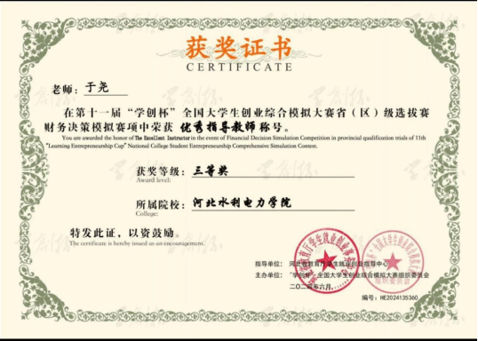入职以来,她注重理论联系实际,积极指导学生参加竞赛,2024年4月份指导学生以《文旅融合,走近承德》题目参加的“我眼中的新时代”项目获评河北省优秀奖。6月份,指导学生参加第十一届“学创杯”全国大学生创业综合模拟大赛获得河北省三等奖,并荣获优秀指导教师称号。11月份,指导学生的《关于对盐碱地改良利用情况的调查研究——以河北省沧州渤海新区黄骅市为例》项目获得调研河北省级二等奖。