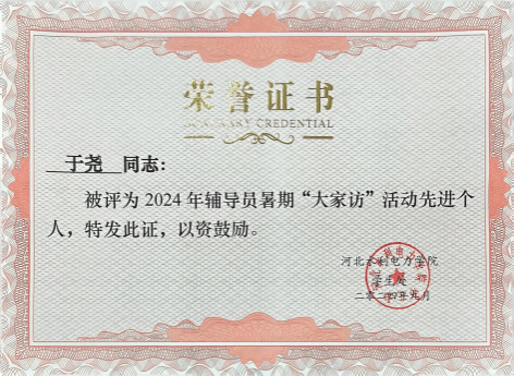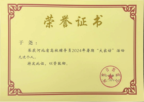 今年暑期,她贯彻教育厅和学校做好暑假“大家访”活动的指示精神,积极拓宽家校沟通渠道,采用“线下送关怀和线上送温暖”相结合的方式,以在学习、生活上有困难的同学为主要对象进行实地走访,深入沧州献县、保定唐县和石家庄正定县等地,详细地向家长反馈学生在学校的学习、生活情况,让家长了解学生在校表现,与家长共同探讨教育方法,促进学生进一步成长,实现家校共育。线上信函家访面向所带的全体同学,她为每位学生家长寄出一封信,书信内容包括学生的在校情况、辅导员的管理措施、学生在校注意事项等,信函内容面面俱到,每一部分内容都精心准备,融入了院系教育者对于孩子们的全身心关爱。在家访过程中,她转换角色,想学生和家长所想,用真诚的心搭建沟通桥梁,关爱学生成长,获得2024年校级暑期大家访“先进个人”荣誉称号,并荣获河北省高校辅导员2024年暑期“大家访”活动先进个人。