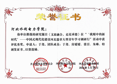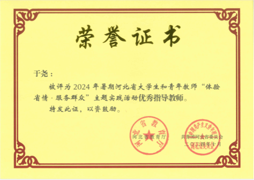 此外,今年暑期她带领经贸系两个省级重点小分队分别前往黄骅市后仙庄和保定白洋淀开展三下乡暑期社会实践工作,被评为2024年暑期河北省大学生和青年教师“体验省情.服务群众”主题实践活动优秀指导教师。